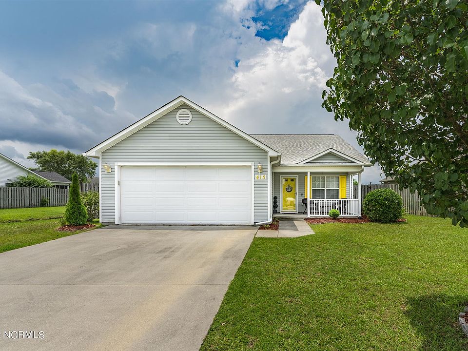 Located on a quiet street, this move in ready home is perfect for a first time home buyer, family or someone looking to downsize! Featuring an open floor plan with vaulted ceilings and a large kitchen. New quartz countertops have been added as well as a subway tile backsplash. There is a two-car garage and a laundry room with storage. The bedrooms and bonus sunroom are located in the back of the home. Ample storage space in bedrooms and bathrooms. A sliding barn door was added in the master bedroom for more privacy while using the vanity. As you enter the back yard there is a large patio deck, great for grilling and entertaining. Additional storage in the utility room. The HOA maintains the front yard and the fence for easy living! Roof was replaced in 2019.