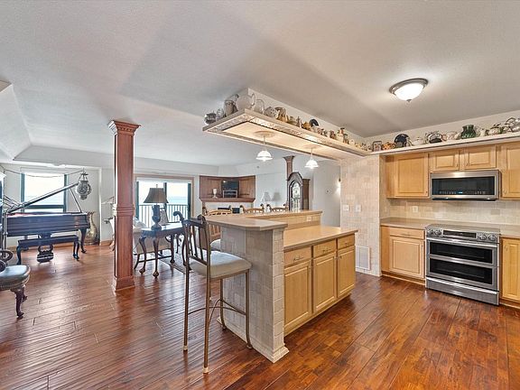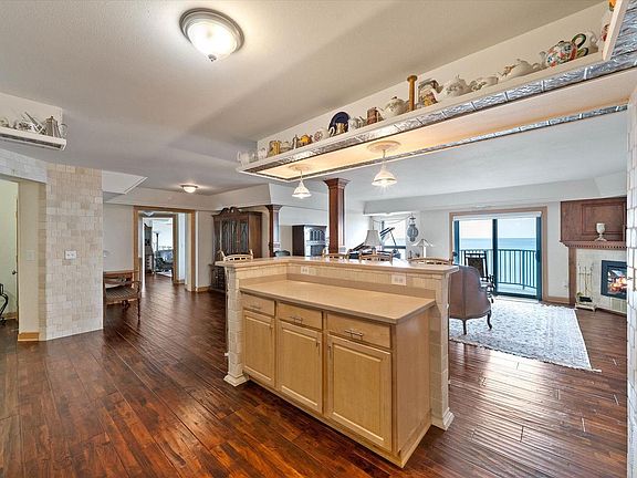 Electric fireplaceViews overlooking marinaTile backsplashCustom pillarsCorian countersTons of storageAcacia wood floors