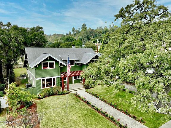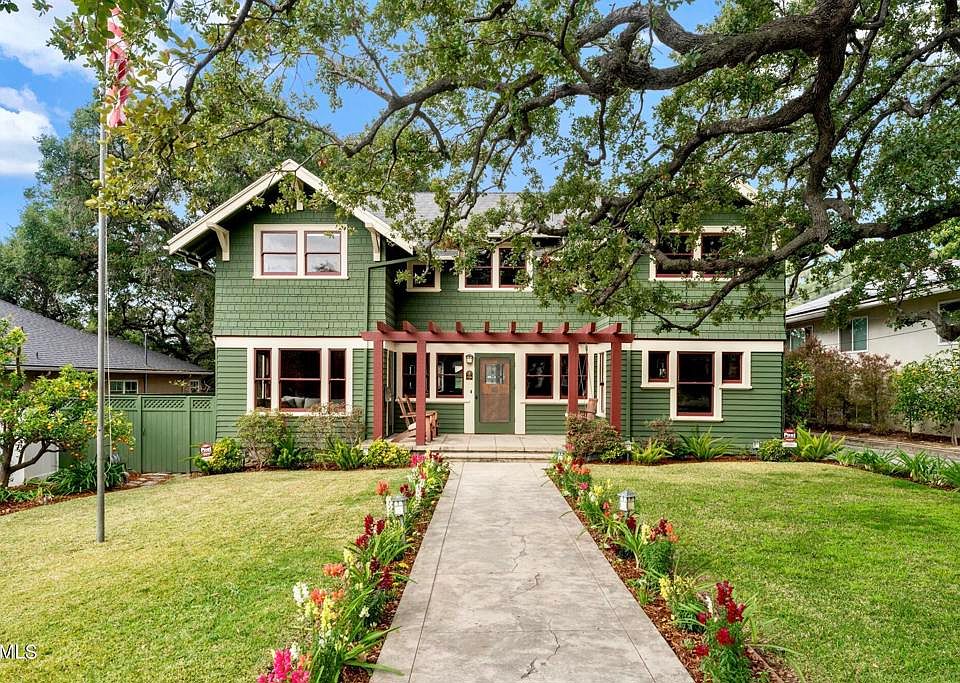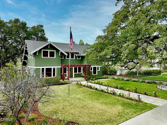 This 1908 Craftsman is the crown jewel on prestigious North Primrose Avenue, a street known for its wonderfully preserved vintage homes. This exquisite residence offers a timeless blend of elegance and historical significance. Designated an Historic Landmark and benefiting from the coveted Mills Act, this distinguished property boasts 4 bedrooms and 2.5 bathrooms within its expansive 3088 square feet. The home is sited on a generous 12,241 square feet lot, featuring meticulously landscaped grounds. A towering oak underscores the striking street presence. Step up to the classic front porch that exudes charm and offers a perfect place to relax, enjoying the wonderful views. The grand foyer features a magnificent river rock fireplace with a built-in oak bench. The room is flooded with natural light. The home's interior is adorned throughout with beautiful original vintage details, seamlessly complemented by modern upgrades. The downstairs features beautiful hardwood floors, original pocket doors and vintage fixtures. The formal dining room features a handcrafted built-in wood sideboard with leaded glass details that is simply stunning. An original gas wall heater is of special interest. The remodeled kitchen, complete with a large center island, is a chef's dream, offering a perfect fusion of functionality and style. There is an informal dining area near the backdoor leading to the backyard and pool. There is the convenience of a full-sized washer and dryer on the service porch off the kitchen. The living/family room features vintage-style wallpaper in pristine condition, has original gas lamps converted to electricity, and a wood pocket door. There is a first floor bedroom with a separate sitting room overlooking the backyard. The adjacent guest half bath could be enlarged to add a shower. The beautifully crafted staircase leads to a full landing with original built-in wood bookcases with a bench. The perfect place to read and dream, while gazing out at the view. The primary bedroom features a large walk-in closet, a separate sitting area and a vintage bathroom. The two additional bedrooms are spacious and offer great closets. They share a bathroom. There is a separate office which leads to a balcony with views of the mountains. The outdoor living space is a true oasis, featuring a stunning pool, perfect for both relaxation and entertaining. The meticulously landscaped yard provides a serene retreat.
