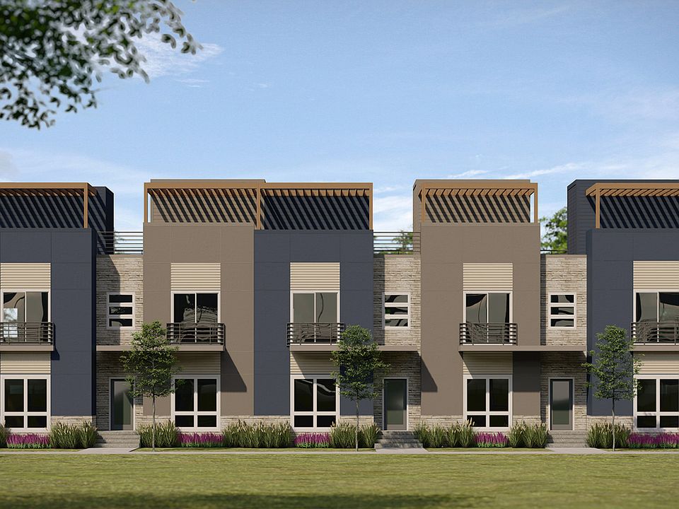 The Asana plan is a three-level interior unit townhome with 2,058 square feet of space with three bedrooms, 2.5 baths, and a two-car attached garage. The first level has a large kitchen that opens up to into a formal dining and living room, with an optional fireplace, as well as a half bath. The second level features laundry, master bed/bath, and two more bedrooms and comes with the option of a dual-master layout or upgraded linen closet. Finally, the third level is dedicated to a wet bar landing, rooftop deck with the option of a pergola and a half or full deck expansion.