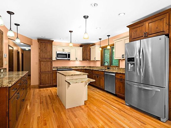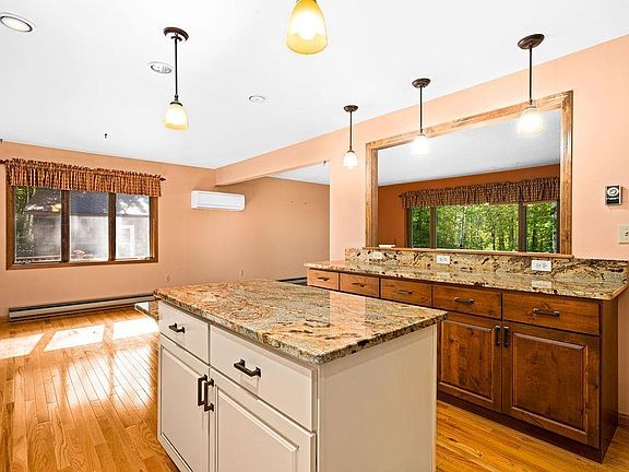 Private 5 acres with a roomy 3+ BR, 3 bath split entry home. 2 car detached garage & 40x70 pole building. Brand new kitchen with big island, granite countertops & hardwood floors. Screen house out back off the DR. Electric heat with a mini split for A/C. Walkout basement. Property located near the start of the North 40 hiking trail! Electric: $311/mo average