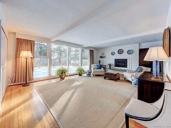 Welcome to Riverbank Farm, a beautiful 9 acres (over two lots) located on the Bantam River! A truly one of a kind property within Litchfield's Historic District with stunning views of rolling property down to the river. Set back from the road, up the circular drive this Mid Century beauty has a flexible floor plan that features 4 bedrooms, 4.5 baths and over 4,000 sqft. Entry floor: Enter the airy foyer with a glimpse of the meadow. The entry floor has one of two primary suites. This suite has a wall of windows, a gas fireplace, hardwood floors and French door access to a patio and the in-ground pool. This room has a large en-suite bath with double sink. Adjacent to the entry is one of the home office/library/den spaces with large windows and hardwood floors. Through the foyer and down a half flight of stairs is the... Heart of the Home: The heart of the home has walls of windows overlooking the rolling property, beautiful views, blue stone patio and pool with mature garden. The living space has room for two seating areas, one with a wood burning fireplace, perfect for cozy nights. The flexible dining area separating the kitchen and living spaces is the perfect setting for a family dinner or a large holiday meal. The spacious kitchen has a huge island allowing multiple cooks to work in the kitchen. Seating for three at the island is a favorite place to complete homework. The kitchen has custom cabinetry, granite counter tops, a gas cooktop, two ovens and built in microwave. Additional storage in the full walk in pantry keeps the open space clean and tidy. There is a laundry and half bath completing this part of the house. This section of the house features radiant heating to keep you comfortable year round. Just out side the two sets of French doors is a blue stone patio perfect for summer living and dining and easy access to the beautiful in ground heated pool all with stunning views of the rolling property. Lower level: In the separate lower level (below the entry level) you'll find a rec room, two additional sunny rooms and a full bath. This incredibly flexible space can be bedrooms for guests, a home gym or more quiet space, perfect for working from home. Upper level: Move to the upper level (above the living/dining/kitchen) to find two bedrooms and two bathrooms. The spacious bedrooms have large angular windows overlooking the property. The south facing bedroom has a dressing area, built in bookshelves and a fireplace for a perfect seating area. The north facing bedroom, the second primary has vaulted ceilings a full bath with walk in shower and walk in closet. What an incredible opportunity to own a waterfront property with a stable and paddocks within Litchfield's Historic District, all while connected to public utilities for peace of mind. Included in the sale is the adjacent separate 2.17 acre building lot at 401 South Street. The property also has a 3 stall barn, garden shed, 2 bay garage and whole home automatic generator. Don't miss the opportunity to enjoy this secluded, riverfront property just steps from Litchfield Center.