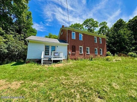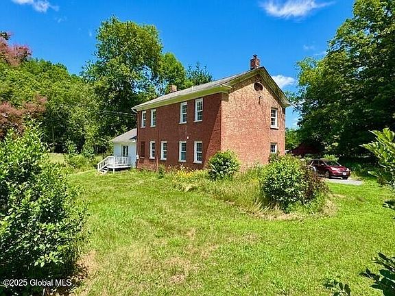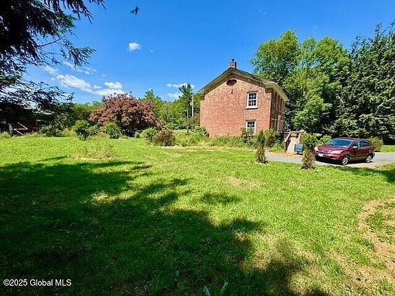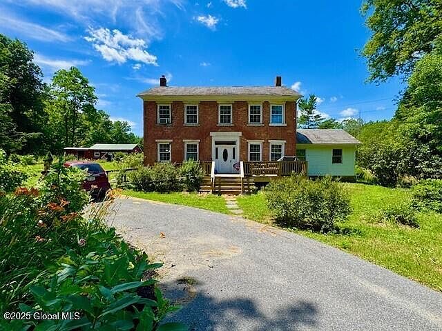 Brick Colonial circa 1810 located on Historic Upper Turnpike Road has been updated nicely top to bottom recently. Great location on 3 private acres surrounded by gardens and beautiful countryside. Large entry foyer leads you to kitchen w/granite countertops and lots of cabinet space, spacious living room with exposed beams & slider to back yard, bedroom or family room w/fireplace and full bath with handicap shower downstairs. Two spacious bedrooms upstairs along with second full bath and laundry with half bath and large walk-in closet on end of landing. Newer heating system and domestic hot H2o and fuel tank. Garden-animal barn w/power & dog run, lots of room to run yard, perennial gardens and fruit trees, small one car barn w/shed across road. Mins to Vermont & Lake George-Saratoga!