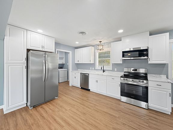 Beautifully updated and move-in ready, this 3-bedroom, 2-bath home combines modern style with everyday comfort. The open-concept floor plan features luxury vinyl plank flooring, recessed lighting, and neutral tones that create a bright, inviting space. The kitchen shines with new cabinetry, countertops, stainless steel appliances, and a convenient flow to the spacious living and dining areas. Both bathrooms have been tastefully refreshed with contemporary fixtures and finishes, Outside, enjoy a fenced backyard—perfect for pets, play, or entertaining. The home features a separate full-sized laundry room and an attached garage for added convenience. With its clean design, quality updates, and convenient location just blocks from Hamilton schools, this home is a must-see for those seeking a turnkey property.