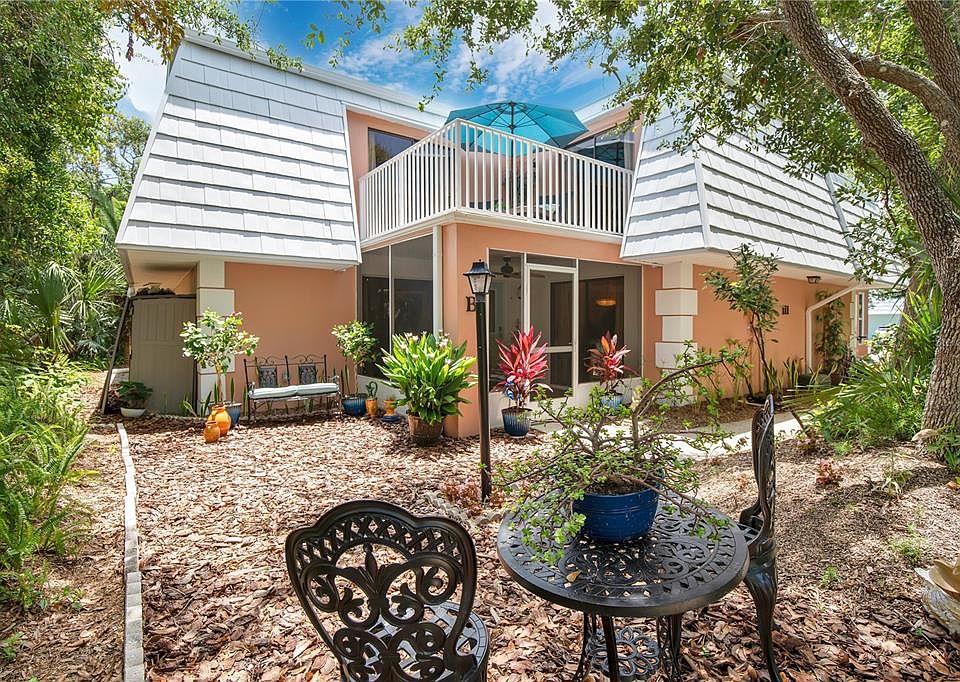 YOUR LITTLE SLICE OF HEAVEN AWAITS!! This beautifully updated townhome tucked away in the charming, coastal community of BAHAMIAN CLUB and just steps to the beach, pool and all the wonderful community amenities is Florida living at its best. And maybe the best part is you can relax from DAY 1 and forget the renovation budget as the work is already done here including the tastefully updated kitchen and baths along with the brand new roof just completed(2025). The tropical landscaping and welcome shade from the canopies of oaks can be enjoyed from either the newly tiled upstairs balcony or spacious, screened patio entry of this home. Step inside and you'll appreciate all the wonderful updates including the neutral tile floors(ground floor) along with the matching wood cabinetry and stone counters in all 3 bathrooms and kitchen. Sliders offer plenty of natural light and allow entry from both upstairs bedrooms to the private balcony - the perfect spot to lounge in the crisp, clean Florida fresh air with a good book and your favorite beverage. Whether you enjoy relaxing to the rhythm of the waves after a short walk to the peaceful sands of the NO-DRIVE BEACH, or prefer a more active day filled with tennis, pickle ball or shuffleboard followed by a dip in the pool; Bahamian Club offers all of this and more. There’s even on-site rental management for those looking for a part time or full-time investment opportunity. Plus the reasonable HOA fee of $485/mo includes your cable + HBO, Wifi/internet, exterior maintenance, grounds maintenance, water/trash/recycling, pest control & more. You deserve the best of the FLORIDA BEACH LIFESTYLE and it’s all available to you now in this lovely towhhome.