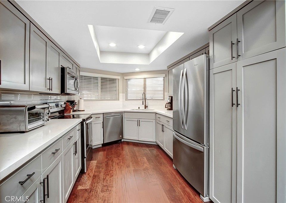 LOOK NO FURTHER!!! This home sits in the beautiful Marina Strand Colony, remodeled condo, top-story location unit, with 12-foot ceilings and a huge skylight, tons of natural light with water views! This home has hardwood flooring throughout with a walnut finish and plush carpet, remodeled living room fireplace, Stainless steel appliances, quartz countertops, new beveled subway tile, a soaking tub, mirrored wardrobe and so much more. This home is a stone's throw from the Marina and the beach as well as dining, shopping, and entertainment. This beauty has it all!!