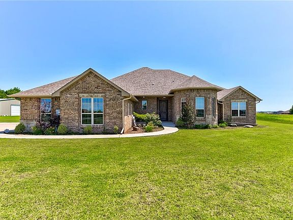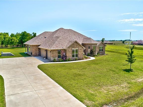 Prepare to fall in love with this stunning custom built home on 2.5 acres! An inviting covered porch welcomes you into the bright open concept living area. In the kitchen you'll find double ovens, a walk-in pantry, and a central island perfect for any aspiring chef. After entertaining, you can retreat to one of two master bedrooms, each complete with its own full bath, walk-in shower, and jacuzzi tub. Enjoy morning coffee on your oversized covered back patio, and rest easy with the comfort of your storm shelter. This home has numerous thoughtful upgrades, including surround sound, retractable screens, a water softener, and two water heaters. There is so much to love about this home and quiet, friendly neighborhood. Enjoy the virtual tour and schedule an appointment to see it today! Shop not included but plenty of room to build one!
