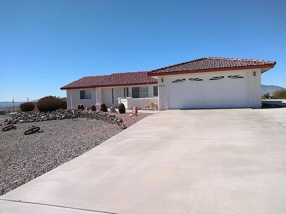 FOR SALE BY OWNER: 1535 Sq. ft. 3 bedroom home with beautiful view of the Nevada Mountains on 1.3 acres with chained link fence and solar gate. 1 master bedroom with private walk-in shower next to dual vanities and large walk-in closet. Split floor plan. 2 other bedrooms divided by full bath. Utility room w/pantry next to kitchen which has quartz counter tops, center rolling island and all appliances ,tile flooring; large living room with Lifeproof fresh oak vinyl floor planking, sliding doors in back exit to viewing area from living room and master bedroom. Drive through boat deep 3 car garage; RV hookup; underground sprinkler system; fenced garden area w/young tangelo and mandarin tree; separate shed, All next to state land ideal for four-wheelers; room for a horse(Boating, fishing and water sports located a few miles away on Colorado River). Major upgrades in last 6 years, new energy efficient air conditioner, replaced ceiling to match columns on back patio, put quartz countertops and sink with new faucets and garbage disposal in kitchen, new water heater, new living room floor, new range, microwave, and painted outside of home. Ft. Mohave, Az. Call for information 1-928-758-8390.