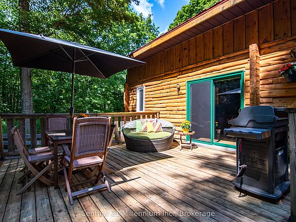 Discover this large 4-bedroom, 3-bathroom log home on a private 4.5-acre property situated on a quiet street surrounded by mature trees. Step inside to a bright, open-concept main level featuring vaulted ceilings with exposed beams and sunlit living and dining areas. The kitchen is ideal for family gatherings, and the main floor includes three bedrooms and a 4-piece bathroom. The upper-level loft serves as a private primary suite, complete with a 3-piece ensuite featuring a jet tub. A spacious second family room can function as a games area or home office, offering flexible living space. The full walk-out basement extends your living area with a separate entrance. It includes two storage rooms, a recreation room with a pool table, a 3-piece bathroom with a shower, a laundry/utility room, and a root cellar, making it suitable for multigenerational living or rental income. Entrepreneurs will appreciate the impressive 650 sq. ft. commercial kitchen addition, fully inspected and approved for a catering business (zoned for home occupation). Equipment available for purchase separately. Enjoy peace and privacy from three decks overlooking the fenced backyard, which features a quarter-acre garden, fire pit, forested trail, and meadow path. The barn is ready for hobbies or livestock, complete with hydro, water spigot behind barn, three stables, storage/workshop space, and a two-acre fenced pasture with gates. Recent updates include new windows, a refinished exterior, a metal roof, new doors, central air, mini-split heat pumps, and a sump pump. Outdoor enthusiasts will love the nearby 300-acre Saugeen Conservation Area and Townsend Lake public access just three minutes away. Markdale and Durham are only 15 minutes away, providing access to in-town amenities. Whether you dream of raising a family, starting a hobby farm, or running a business from home, this property is move-in ready!