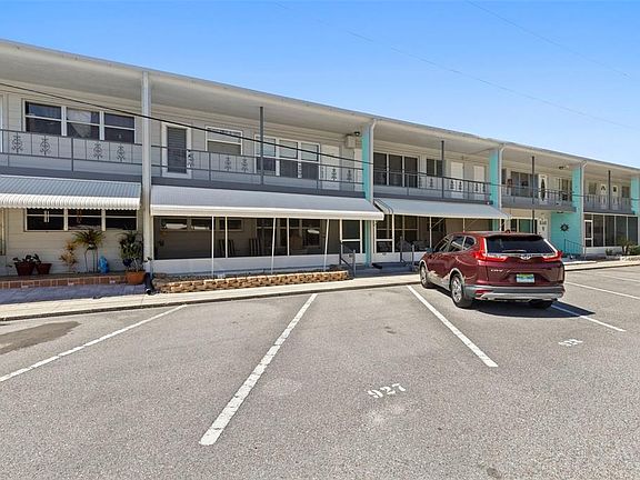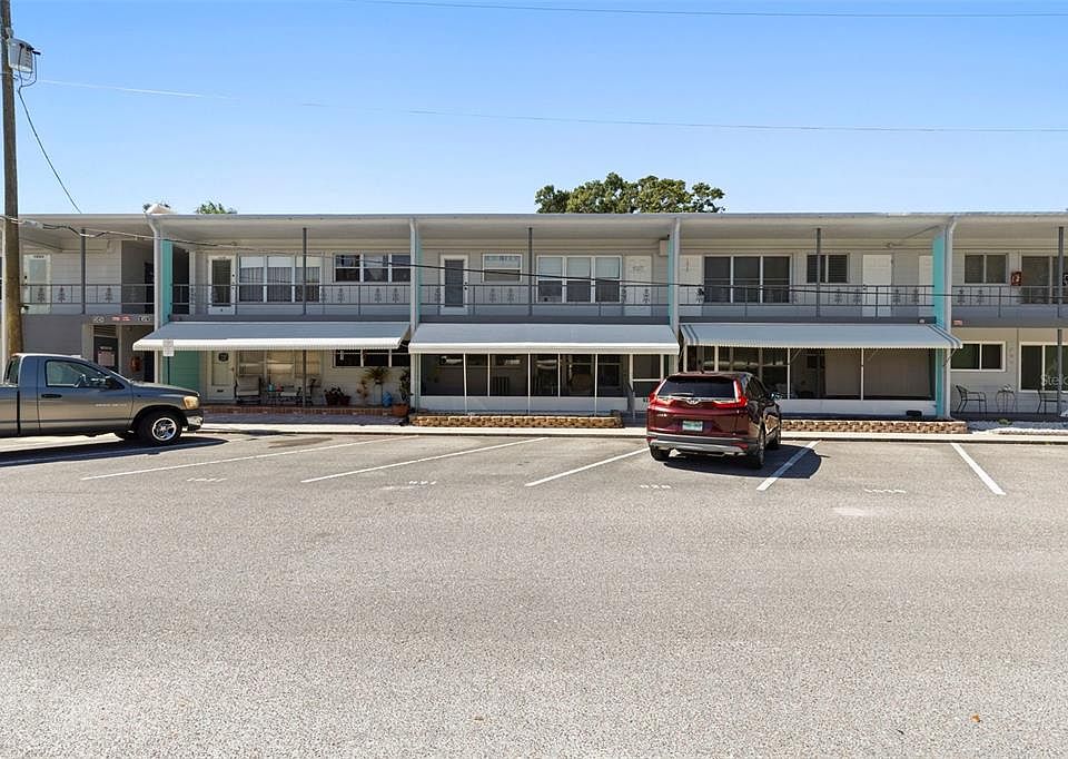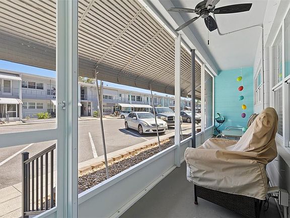 Welcome to Palms of Paradise East (formerly Clearview Oaks), a vibrant, pet-friendly 55+ community where comfort meets convenience. This desirable ground-floor 2-bedroom, 1-bath condo is move-in ready and not located in a flood zone. Your assigned parking space sits just steps from the screened front porch. Inside, wide-plank vinyl flooring flows through a bright living and dining combination. The adjacent kitchen features granite countertops, a stylish subway tile backsplash, and all appliances. A flexible rear bonus room expands your living space and adds excellent storage, while the centrally located bathroom is perfectly positioned between both bedrooms. A covered rear patio provides a peaceful spot for morning coffee or evening unwinding. The reasonable monthly HOA fee covers cable TV, internet, water, sewer, trash, building insurance, exterior maintenance, lawn care, reserves, on-site management, and access to community amenities. Residents enjoy an active lifestyle with a clubhouse, library, and shuffleboard courts. Please note that leasing is not permitted, helping maintain a stable and quiet residential atmosphere. Ideally situated, you are under 10 minutes to the Tyrone Mall area for shopping and dining, and about 20 minutes to the award-winning Gulf beaches and vibrant Downtown St. Petersburg. Do not miss your chance to live in one of the area’s most welcoming 55+ communities. Schedule your private tour today!