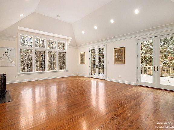 This sophisticated and spacious home on the NE side of Ann Arbor provides a rare combination of lifestyle living in a gorgeous setting with many upgrades and amenities. This setting is special. Located just outside the City Limits you will love the convenience to Ann Arbor, the University of Michigan, and all Hospitals. The surrounding land is gorgeous with mature trees and lots of privacy. The exterior includes a deck, private patio, extensive landscaping, and dog run. The interior provides an expansive living space perfect for all your needs. Highlights include a welcoming entry foyer, Great Room with vaulted ceiling, Brazilian cherry floors, fireplace, and wall of glass to the backyard, custom cherry kitchen with granite counter tops, SS appliances, Sub-Zero frig, and breakfast nook, flex use family room with fireplace and bookshelves also makes a great dining area, study with French doors, luxury main level primary bedroom suite with spa-like bath with travertine stone tile, 2nd main level BR suite & laundry room. The upper level includes a large bonus room, 3rd BR and bath, & sitting room. The finsished lower includes large rec room, exercise, & bath. There are multiple locations to easily add several additional bedrooms, Primary Bath, Rec Room: Finished