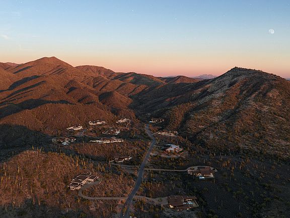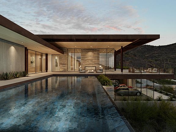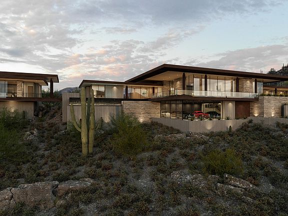 The Six Shooter residence seamlessly floats in harmony with the natural landscape through carefully selected rustic materials, such as rubble stone, concrete and raw steel. Perched high on the gentle hillside, this home offers panoramic views and ultimate privacy amidst ancient saguaros. The lower 7-car show garage not only serves as a focal point, but elevates the home even higher, transcending the hillside for commanding views. The great room is an open-concept space that seamlessly connects the front terraces with mountain vistas unfolding before you. The private primary suite, strategically hovering above the desert, offers utmost seclusion and astonishing views. The guest wing and lounge open up to the pool and terrace area, creating an oasis for relaxation and social gatherings.
