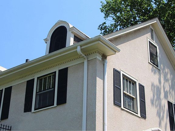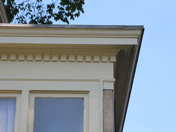 AUTHENTIC PERIOD DETAILS: The balanced, symmetrical façade boasts a striking columned portico, original woodwork and trim, classic dentil molding, distinctive circular dormers, and an impressive wrought-iron perimeter fence evocative of a bygone era.