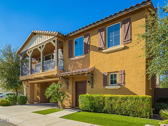 Beautiful two-story home in Cooley Station! Offering 3 beds, 2 baths, 2-car garage, great curb appeal, and a manicured landscape w/artificial turf. The inviting interior showcases tons of natural light, neutral paint, recessed lighting, and tile & carpet t/out. You'll love the desirable great room on the upper level, paired with multi-sliding doors that open to the balcony! The impressive kitchen boasts SS appliances, granite counters, staggered cabinets, a tile backsplash, and an island w/breakfast bar. The main bedroom is downstairs, ensuring ultimate privacy! It features an ensuite with dual sinks, soaking tub, & a walk-in closet. Equipped with surround sound, this gem makes entertainment a bliss! The private yard, with a covered patio, is the ideal spot to enjoy BBQ. What a RARE find!