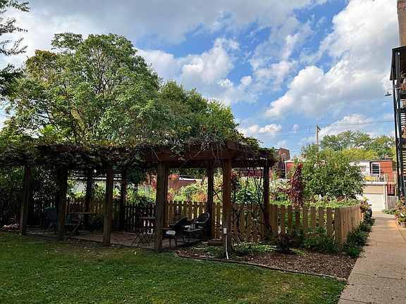 In the back yard is a large landscaped garden with mature trees and a pergola. Part of the garden is enclosed by a picket fence and serves as an organic community garden for residents. Plots may be available for a nominal fee (you are welcome to ask).