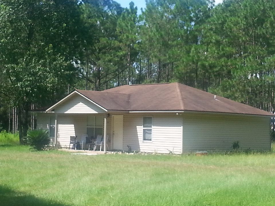 Enjoy country living with like-new 3/2 Traditional style single family residence on 2.5 acres. Ideal for family living with planted pines for privacy and grassy open lawn. Concrete open patio across back ideal for bar b ques and picnics. Interior accented by new laminate hardwood flooring in living area, tile in kit/dining , split bedroom plan, walk in closet in master. Large living room, kitchen combined with dining room. separate utility room, ..come see this cute home and land iust waiting for a new family..