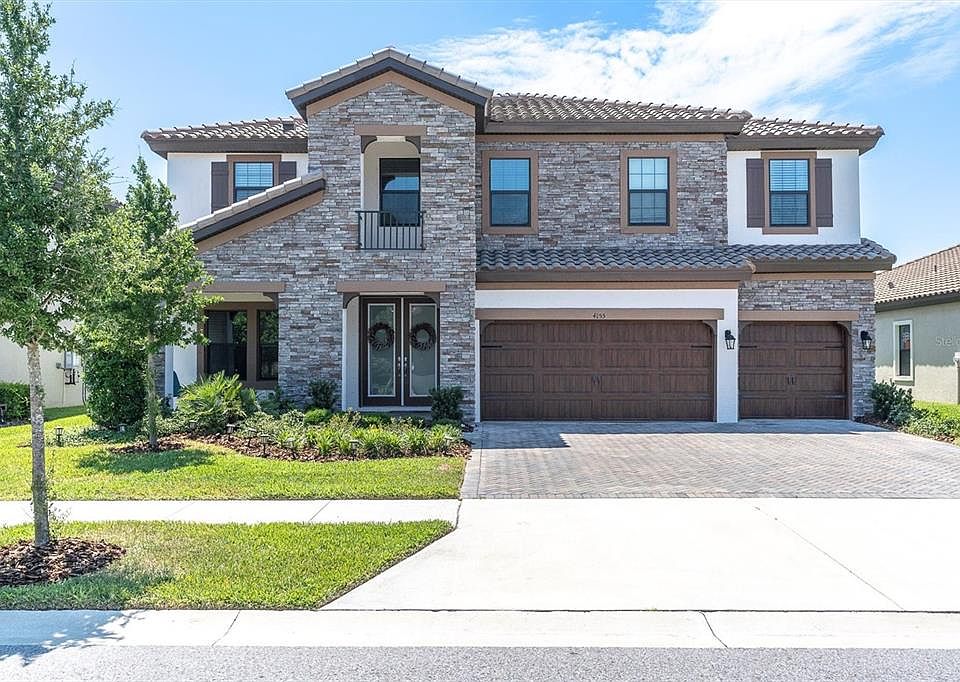 LIVE THE MODERN LUXURY LIFESTYLE IN DESIRABLE STARKEY RANCH ~ NO FLOOD ZONE! Introducing a beautifully appointed Homes By Westbay Virginia Park custom built in 2021 spanning 3545 sqft offering 5 br, 4 ba, and 3-car garage, plus office, massive bonus room with a covered and screened lanai facing a large backyard that includes a playset! ENTIRE INTERIOR FRESHLY PAINTED ADM ALL NEW CARPET COMING SOON! The impressive Tuscan-inspired exterior, with its sophisticated tile roof, fine stacked stone accents, pavers, a front porch & lush landscaping sets the tone for the luxury within. Etched double glass inlay front doors welcome guests into the foyer. To the left is a dedicated office space with double French doors. A warm luxury vinyl flooring flows seamlessly through the main living areas, complemented by 8-ft doors that enhance the sense of grandeur. The signature open floor plan unfolds as you enter the main living area. A spacious grand room is fashioned with stylish ceiling fan, natural light from the pocketing 18’ sliders and can lights illuminate this sophisticated yet inviting space. Prepare to be impressed by this Modern Gourmet Kitchen featuring an abundance of custom 42in Shaker Maple cabinets & drawers in Grey Dove complimented by black hardware, Custom Hood, expansive island with seating & storage, Calcatta Alto quartz countertops and a step-down bakers rack with desk and additional cabinets. Appliances include 36" gas range, built in oven & microwave, Refrigerator and dishwasher. Modern lighting and Gooseneck faucet add to the attractive design element. The dining area in the kitchen fits a large table with 8 or more chairs and is great for entertaining. A guest bath off the grand room also could serve as a pool bath with Br 5 situated on 1st fl. Ascend the stairs to the massive bonus room which is multifunctional for many uses. Escape to the Primary Suite through the double door entry revealing a spacious sanctuary with ceiling fan and can lights contrast by dark blinds. Spa like ensuite exudes luxury with walk-in shower, sunken garden tub, 2 separate vanities with Navel cabinets and stylish complimentary quartz plus walk in closet. Well-sized br 3 & br 4 feature adjoining Jack & Jill bath. The laundry room is conveniently located close by. A 4th br and hall bath complete the 2nd story. Spend time relaxing on the extended covered and screened lanai with breezy ceiling fan. A large fenced backyard includes playset and can easily support a variety of outdoor design ideas. Additional features include: 8 ft interior doors, gas water heater with expansion, garage storage, recessed lighting throughout, paved driveway, lanai offers gas for grill, water softener, hurricane shutters and portable generator included! Starkey Ranch offers an unparalleled lifestyle w/ its Magnet K-8 school, 3 community pools, playgrounds, dog parks & 20 miles of trails and more! Enjoy regular community events and easy access to shops, restaurants & Publix. Make this beautiful home yours!