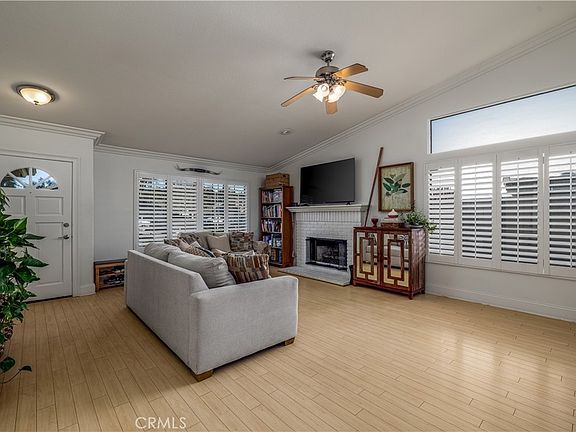 Step inside to light wood flooring that flows throughout the home, complemented by elegant plantation shutters and crown moulding. The main living area is warm and inviting, featuring vaulted ceilings that enhance the sense of space and natural light, along with a cozy fireplace—perfect for relaxing evenings or entertaining guests.
