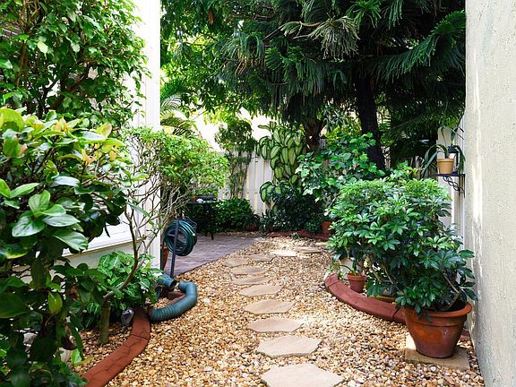 Outside, the backyard is a private oasis with lush, meticulously maintained landscaping and two outdoor seating areas. A large patio and hidden nook provide space for entertaining or relaxing in peace, creating a serene atmosphere reminiscent of Bali or Thailand.