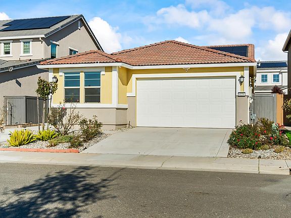 Wow! Stunning, almost brand new single-story home that is sparkling clean & move-in ready with an abundance of gorgeous, modern finishes. Desirable location across the street from serene pond and picturesque walking trail and near friendly neighborhood park. Get all the benefits of a newer home PLUS the backyard is complete, window treatments are in & newer washer/dryer/fridge are included! Beautiful gourmet kitchen with trendy, modern finishes - granite countertops, stainless steel appliances, large island, double ovens & gas cooktop. Enjoy your low maintenance backyard with custom turf and covered patio seating area - no lawnmower required. Front bedroom offers peaceful view of the pond & walking trail. Master Bedroom offers privacy being on a separate wing from other bedrooms. Relax in your spa-like master bath with designer tile floors, contemporary granite countertops, dual sinks, oversized soaking tub & large walk-in closet. Home is energy-efficient with leased SOLAR, whole house fan & tankless hot water heater. NO HOA & Elk Grove School District. New elementary school is being built in the neighborhood within walking distance.