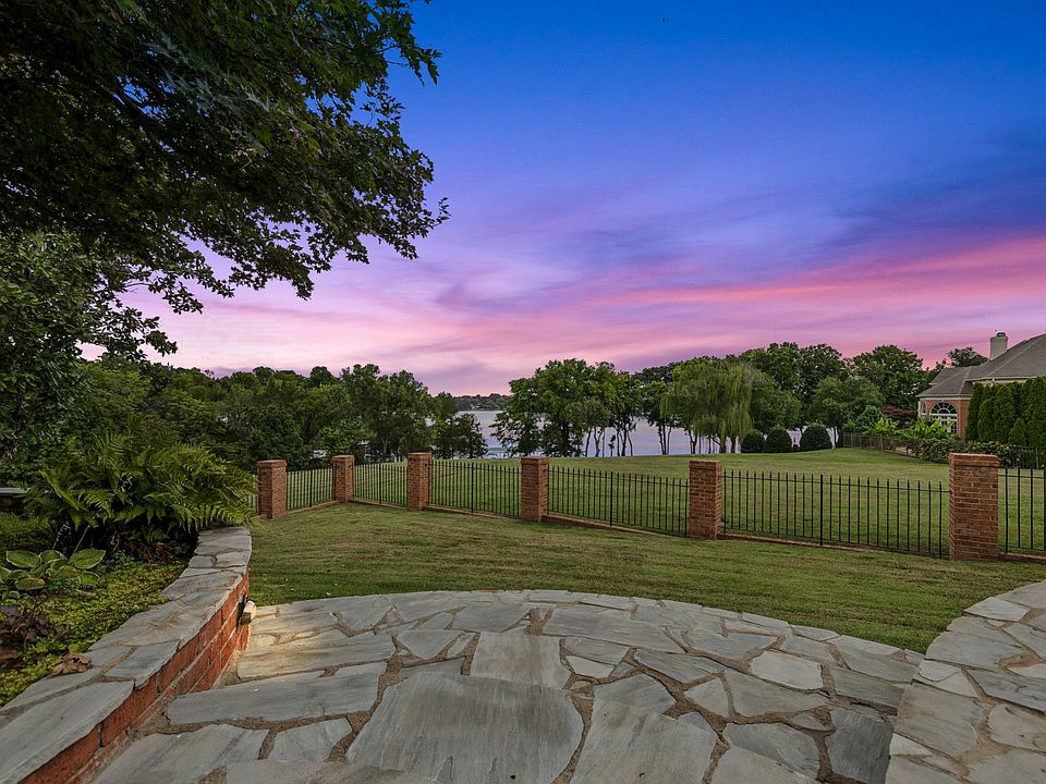 Inside, a grand two-story foyer with a beautiful staircase leads to a sunken living room with built-ins and one of three fireplaces. Enjoy a wine room, formal dining,a butler’s pantry with granite counters and custom cabinetry. The chef’s kitchen is equipped with Thermador and Viking appliances, a center island with breakfast bar, pantry, a bay window overlooking the lake, and a classic back staircase leading to the upper level.