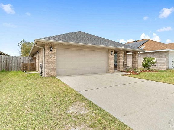 Beautifully maintained all brick home featuring a spacious open layout, three bedrooms, two full baths and located with easy access to Interstate 10, Pensacola, and PeaRidge shops and restaurants. Decorative arches, trey ceilings, rounded corners, 5-1/4 baseboards, an HVAC air purifying system, whole house water softening system and ceiling fans in every room are just a few of the upgrades this home has to offer. The home is also storm ready with hurricane protection devices for the windows and a generator transfer swich for back up storm power. The Foyer and dedicated dining area welcome you in, and large windows fill the space with tons of natural light. The Kitchen is open to both the Dining and Living area and features a breakfast bar for more casual dining and easy entertaining. The large kitchen offers tons of cabinets, ample counter space for your coffee maker and food prep, stainless steel appliances and a pantry for even more additional storage . The Living Room is bright and open with lots of windows and a trey ceiling that make the space feel grand, and includes a french door that leads out to the covered back patio. The Primary bedroom is spacious with a decorative boxed ceiling, large walk-in closet and an en-suite bath with double sink vanity, upgraded custom shower and extra storage. The additional bedrooms share a full guest bathroom in this very functional home. The backyard is the perfect size for easy maintenance, is fully privacy fenced, and includes a deck with decorative pergola. Be sure to visit our 3-D virtual tour.