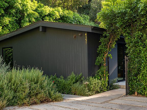 Nestled behind lush hedges and mature trees, this exquisite single-level retreat offers unmatched privacy and seamless indoor-outdoor living. Located South of the boulevard in prime Studio City, this thoughtfully curated multi-structure compound was masterfully designed and built by renowned designer Rob Diaz. Set on an expansive lot, the home features a sleek, modern design with clean architectural lines and a strong connection to nature. Inside, the open-concept layout is both warm and sophisticated, highlighted by natural wood beams, wide-plank flooring, and custom cabinetry. The chef's kitchen stands out with its striking dark stone backsplash, light wood cabinetry, brass fixtures, and skylights that bathe the space in natural light. A spacious center island invites casual dining and effortless entertaining. The primary suite offers tranquil views of the pool, a luxurious spa-inspired bath with soaking tub, and a generous walk-in closet. The beautifully landscaped grounds include multiple outdoor lounging areas, a sparkling pool ideal for year-round use, a wood sauna, hot tub, and cold plunge. One of the two structures is perfect for an art studio or creative workspace. Enhancing the compound's appeal, the fully transformed ADU showcases high-end design with a refined living space, kitchen amenities, private bedroom, and curated finishes.