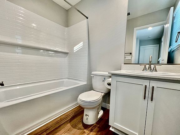 All bedrooms are upstairs. Primary room featuring 2 walk in closets, a full bathroom, soaking tub & separate shower. Two additional bedrooms and a full bathroom. Stacked washer & dryer included and located upstairs for easy accessibility.
