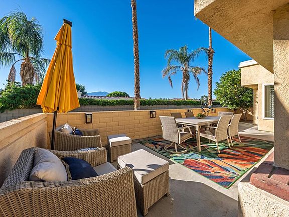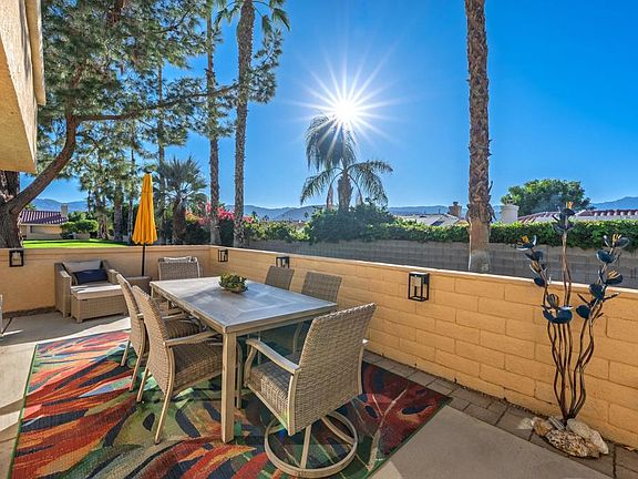 Beautifully Updated Desert Retreat in Casablanca, Palm Desert. Nestled in the heart of Palm Desert, just minutes from the valley's premier shopping, dining, and entertainment, this beautifully updated home offers the perfect blend of comfort and sophistication. Located on a quiet cul-de-sac overlooking a lush greenbelt and panorama views of the San Jacinto Mountains, the residence features two inviting patios ideal for outdoor living and enjoying. Inside, soaring ceilings and skylights fill the space with natural light. Plantation shutters, upgraded lighting, fans, and hardware complement the bright, open design. Laminate wood flooring runs throughout the main living areas, adding warmth and style. The great room features a custom-tiled gas fireplace and direct access to the rear patio. The modern kitchen showcases slab granite countertops, stainless steel appliances, and upgraded soft-close cabinetry. The primary suite is a private retreat with a slider to the patio, a large walk-in closet, and a luxurious bath featuring dual granite vanities, an oversized soaking tub, and a custom-tiled shower with rimless glass enclosure. The guest bath mirrors the same quality finishes with a quartz vanity, custom tile shower, and designer fixtures. A spacious guest bedroom includes mirrored wardrobe doors and custom built-in storage. The two-car garage offers abundant storage space and a dedicated nook for a golf cart. Enjoy the serenity and style of Casablanca--where mountain views, modern upgrades, and resort-style living come together beautifully.