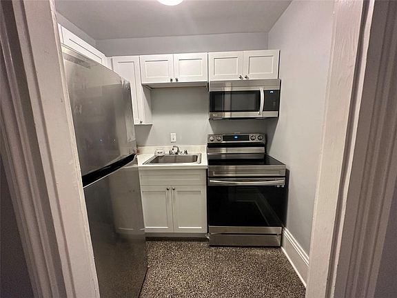 Burgundy streetFrench doorsStainless appliancesChic tiled-shower bathFresh paintAiry bedroomSparkling new kitchen
