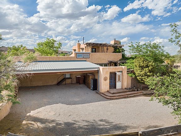 A breathtaking one-of-a-kind contemporary southwest home in the heart of Corrales! Enjoy mountain VIEWS from multiple outdoor patios w/ pergolas, vines & Wistaria surrounding! Unique touches throughout include nichos, exposed wood & adobe, plaster walls & brick flooring! Open floorplan w/ tons of natural light and all bedrooms separate from eachother make it suitable for multi-generational living, Airbnbs or families. Primary guest suite on main level w/separate entrance & a second primary suite upstairs w/balcony & stunning mountain VIEWS! Gourmet kitchen w/ kitchenAide stainless steel appliances that include a double oven & wine cooler-perfect for entertaining! .75 acre lot is very private as its fully fenced & spacious side yard allows space for RV or boat. A truly enchanting oasis!