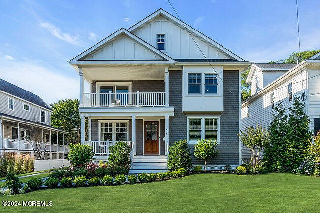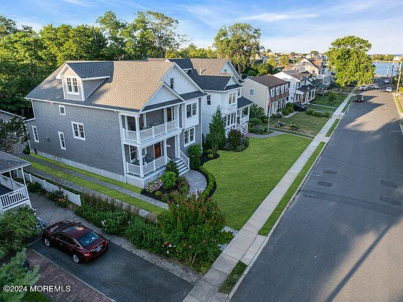 Nestled on quiet Central Avenue in charming Spring Lake, this elegant home exemplifies coastal living at its finest. Meticulously designed, this property blends blues & whites, interior designer finishes & stunning wall paper, with custom molding throughout just unpack. The large open-concept family room flows into the spacious kitchen and custom bar nook for delightful entertaining. On a beautiful day, open the bar window to the outdoor deck and grill space. Countless places to have a cup of coffee, front breezy porch, private back patio or 2nd floor deck with water views. Inviting entrance way wows you into a sitting room and an office, either can also transform into a downstairs bedroom with a full bathroom. On the second floor, the primary suite has everything you need to unwind and relax ... beautiful custom closet, full bathroom and deck.