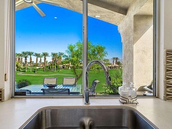 This beautiful & meticulously maintained Acacia-4 sits on an elevated lot with views of the Arnold Palmer Grove-4 course and majestic Chocolate mountains in the background. Upgrades include totally remodeled kitchen (2023) with new counter tops, gas cooktop, stainless appliances, chic backsplash, gooseneck faucet, new water heater (2023), & rear patio pavers. The dining area houses a huge wall to wall custom buffet with two beverage coolers; one for wine and one for non alcoholic beverages. The original pony wall in the great room has been removed to create an expansive feel & a flat screen 65'' wall mounted TV sits above the fireplace. Each bedroom is ensuite and one of the guest bedrooms has a custom wall to wall desk plus two pull-out sofa beds for guests & family members to enjoy. The lovely primary ensuite boasts a frameless shower stall, jetted tub, and looks out to a serene private patio for maximum relaxation. The 2 car garage plus golf cart space has an epoxy floor and mini split A/C. Located in the HOA where monthly dues include all gardening (front yard, courtyard & rear) exterior water, tree trimming, painting & electricity, roof maintenance, wi-fi, cable, trash, & pest control, all for lock & leave stress free convenience. One of the 38 community pools is just 4 doors away, Club membership is available with no wait, & Turnkey furnished.