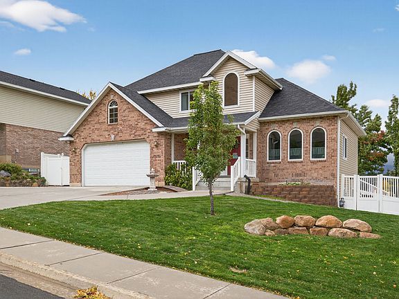 Wake up to stunning mountain views and end your day watching the valley lights and Utah Lake shimmer below. Perched on a peaceful corner lot, this inviting home blends comfort and character throughout. Inside, enjoy an open, light-filled layout with new energy-efficient windows, a sliding patio door, and a new furnace with a smart thermostat for year-round comfort. On the main level, enjoy both a living and family room, plus an open kitchen and dining area. The primary suite features a walk-in closet and a relaxing jetted tub. The fully finished basement adds three additional bedrooms, a separate storage room, and an open area perfect for an exercise nook, reading spot, or play zone-with a charming playhouse tucked under the stairs. An extra-large two-car garage offers space for storage or a workshop. Don't miss the spacious attic above the garage, perfect for extra storage or a future creative space. Outside, unwind by the fire pit in the partially landscaped yard, park your RV or boat on the gated side pad, and store gear in the detached shed. With breathtaking views, versatile spaces, and thoughtful updates, this home is made for comfort and lasting memories.
