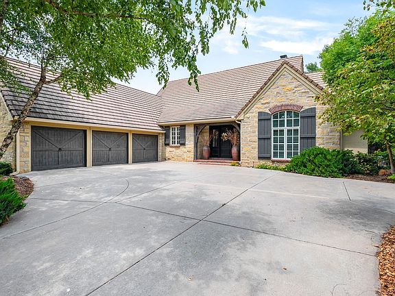 Situated within the exclusive gated community of Flint Hills National, this extraordinary residence offers unparalleled luxury and meticulous care. With 4 bedrooms, 3.5 bathrooms, and 5,274 sq ft of finished space, 416 E. Flint Hills National Ct. features an array of amenities perfect for you. As you enter, you are greeted by a formal living area adorned with rich hardwood flooring, tall ceilings, crown molding, and a gas fireplace. Expansive windows fill the space with natural light. The adjoining dining area, featuring a trayed ceiling with a chandelier, seamlessly flows into the hearth room. Here, you can relax by the cozy fireplace or step through French doors onto the covered patio. The chef's kitchen stands out as a centerpiece, featuring granite countertops and professional-grade appliances, including a Thermador gas range, Sub-Zero refrigerator, Whirlpool built-in microwave, and Bosch dishwasher. The space is further enhanced by an oversized island with a breakfast bar and cushion-close drawers and cabinets. The main level also includes a luxurious master suite, complete with a spa-like ensuite featuring a jetted tub, double vanities, and dual walk-in closets. An additional bedroom with a private bathroom and a spacious laundry room with built-ins and a sink complete this level. Descend to the lower level to find an expansive family room with view-out windows, a fireplace, and built-in floor-to-ceiling bookcases. This area offers the perfect setting for gatherings, enhanced by a granite wet bar. Unique to this home, the basement includes a wine cellar, an exercise room, a cedar closet, and ample storage space. Two additional bedrooms and a full bathroom provide comfort and convenience for guests. Outside, the covered patio with an outdoor kitchen and built-in heaters ensures year-round enjoyment, while a stone patio invites you to unwind as you overlook the private, tree-lined backyard. Recent improvements include new heat and air unit and built in grilling station on the patio. Experience the epitome of fine living in Flint Hills National by scheduling your private showing today!