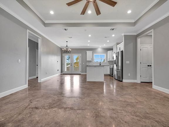 Welcome to this thoughtfully designed 2023-built home offering a desirable 3 bedroom, 2 bathroom split floor plan with clean lines and modern finishes throughout. The open-concept kitchen features custom cabinetry, granite countertops, and a spacious island that anchors the living area, making it ideal for both daily use and entertaining. Polished concrete floors provide durability and a sleek, contemporary aesthetic. Ample storage is found throughout the home, including custom built-out closets and a convenient drop zone to keep life organized. The primary suite is privately situated and includes a walk-in shower and generous closet space. Secondary bedrooms are well-sized and thoughtfully placed on the opposite side of the home. Step outside to a covered patio overlooking a fully fenced backyard, perfect for children, pets, or outdoor gatherings. Located just one block from the elementary school, this home offers a rare blend of modern design, comfort, and convenience.