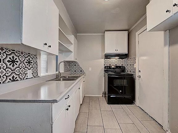 The kitchen features designer tile, a double sink and a peek through to the dining room.