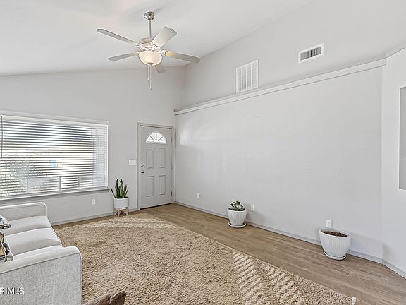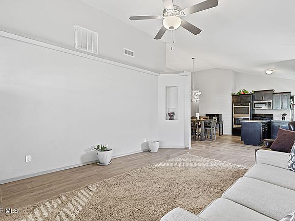Step into comfort with this inviting four-bedroom, two-bath single-story home featuring a beautiful brown-tone stucco exterior and easy-maintenance gravel landscaping. The entry opens to a cozy living area with soft carpet flooring, leading into an open-concept kitchen complete with sleek granite countertops, a centered island, and rich dark wood cabinetry. The second living space overlooks the kitchen—perfect for family gatherings or entertaining guests.