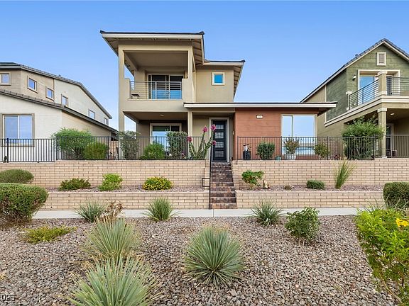 Beautifully upgraded home in Cadence master-planned community. This home features paid-off solar panels. Primary suite located downstairs offers a designer closet with built-in shelving and a primary bathroom with custom walk-in shower. Second bedroom includes a queen-size Murphy bed. Gourmet kitchen showcases stainless steel appliances, double oven, custom backsplash, and spacious island with sink. The open living area is enhanced with surround sound and connects seamlessly to the outdoor retreat through telescoping sliding doors with electric blinds. The covered patio includes dual ceiling fans, recessed lighting, and provides the perfect setting for relaxation or entertaining. Upstairs, you’ll find a third bedroom with full bathroom and an expansive loft with a private balcony that captures stunning views of the Las Vegas Strip. Located just steps from Cadence Central Park, Smith’s Marketplace, shopping, dining, and more, this home combines style, comfort, and unbeatable location.