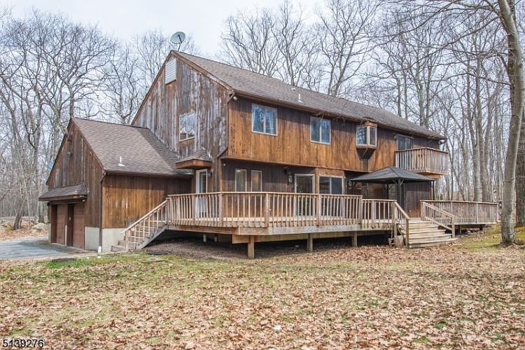 Are you looking for a large home with land, peace and quiet, and privacy? Welcome to this Oasis in the Woods. This recessed property has a long driveway away from the street leading to a circular driveway with over 4 acres of land. This 4 bedroom 3 full bath contemporary style home offers vaulted ceilings with plenty of windows of natural light. Enjoy the lemonade porch into a 2 story foyer. To the left there is a sunken living room with wood floors, to the family room with wood burning fireplace. The enormous kitchen with breakfast bar and pantry is very functional and allows for large groups to gather. Dining room with wood floors has french doors for privacy or can be used as bdrm if needed. 1st floor full bath, 2 car garage, and mud room off the kitchen. Upstairs primary bedroom with brick fireplace, loft off the primary for office exercise w skylights room overlooks living room below, 2 walk in closets to a large primary bath jacuzzi tub. Primary also has sliders to walk out balcony. Additional 3 large bedrooms on this floor with a main bath with double vanities. 2nd fl Laundry room and attic fan (for cooling). Unfinished large basement with 2 entrances (walkout to garage). Newer systems including septic (10 yrs), boiler, Central AC units, iron removal system, and sump pump. Sliders from kitchen and family room lead to a large deck (61'x14') with outdoor speakers. Additional features include security system, backup generator hookup, 200 amp service.