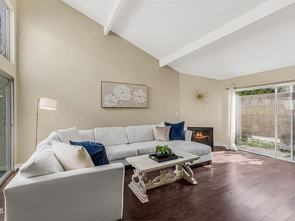Welcome to this beautifully designed 2-bedroom, 2-bath home, where soaring double-height ceilings and abundant natural light create an inviting sense of space and serenity.Step inside to a welcoming dining area with dramatic volume ceilings that flow effortlessly into the well-appointed kitchen. The kitchen features tile flooring, a dual-basin sink, lots of counter space, and a built-in dishwasher, ideal for everyday cooking and entertaining alike. At the heart of the home, a private central patio connects the spaces, filling the interior with light and a refreshing cross-breeze.The spacious living room impresses with double-height ceilings, a cozy fireplace, and sliding glass doors that open to the rear patio, perfect for indoor-outdoor living and relaxation. The private primary suite includes laminate flooring, a walk-in closet, an ensuite bath with a walk-in shower, and direct access to the back patio. A comfortable second bedroom offers generous closet and sits adjacent to a full hall bath with a tub/shower combination.Located in an excellent community just minutes from the beach, this home offers access to fantastic amenities including a tennis court, spa, clubhouse, and more. With two inviting patios, airy architectural design, and the ease of single-level living, this light-filled home combines comfort, convenience, and coastal charm in one exceptional package.