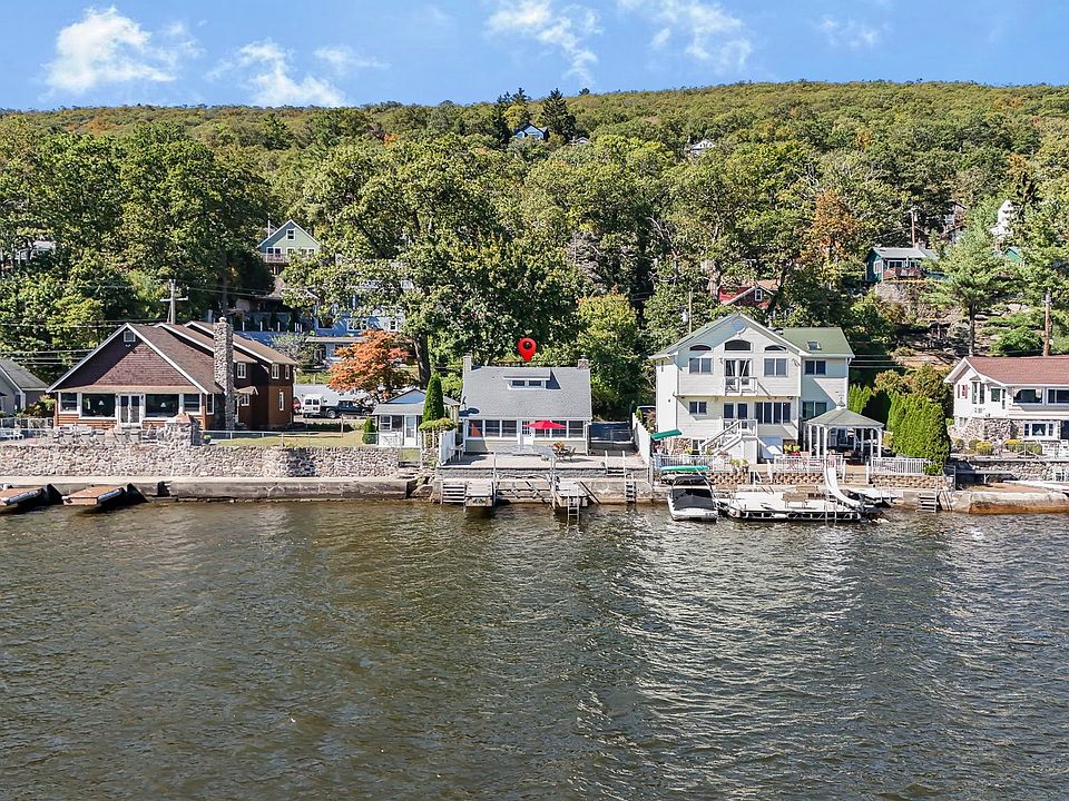 A True Greenwood Lake Retreat! Experience lakefront living at its best in this beautiful Cape on the sought-after west shore of Greenwood Lake. With breathtaking lake and mountain views from nearly every room, this home perfectly blends rustic charm with modern comfort. Step inside to an inviting all-pine interior where the cathedral-ceiling living room and stone fireplace create a warm, open feel. The updated kitchen features granite counters and stainless steel appliances, seamlessly flowing into the main living area - perfect for gatherings large or small. This home offers three comfortable bedrooms and 1.5 stylish baths, providing plenty of space for family and guests. The enclosed sunroom overlooking the lake is the heart of the home ideal for morning coffee, quiet reading, or taking in incredible sunset views year-round. Step outside to a spacious paver patio built for entertaining, with room for dining, relaxing, and enjoying the outdoors. A concrete bulkhead and two new cantilever docks give you direct access to the lake perfect for boating, fishing, or simply soaking in the scenery. Additional highlights include a detached two-car garage, guest parking, central air, and low-maintenance living, so you can spend more time enjoying life on the water. Located within walking distance to the NYC bus stop, this home offers easy access to the city while providing a peaceful lakeside escape.