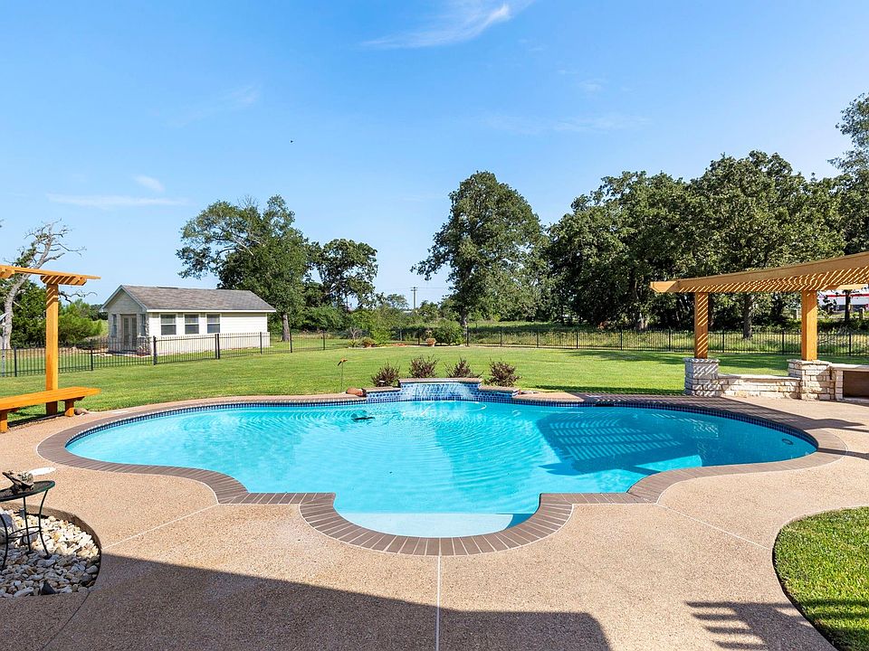 Discover your slice of paradise in this stunning 3-bedroom, 2.2-bathroom home nestled on over an acre in an exclusive gated golf course community. Wake up to views of the 14th green from your front porch! The living room features vaulted wood-paneled ceilings that creates an impressive backdrop. The spacious kitchen features granite counters, built-in refrigerator, double ovens, and a breakfast bar perfect for morning coffee or evening wine. The primary bedroom suite is a true retreat with whirlpool bath, separate shower, dual walk-in closets, and double vanity. Adjacent flex space offers endless possibilities as an office, workout room, or nursery. Two additional bedrooms share a convenient jack-and-jill bath. Outside, entertain in style with a pool, extensive covered patio, and pergola with built-in grill. The 15x15 shed provides extra storage, while the 3-car garage plus golf cart space accommodates all your vehicles. Circle drive entry adds elegance to this golfer's dream home.