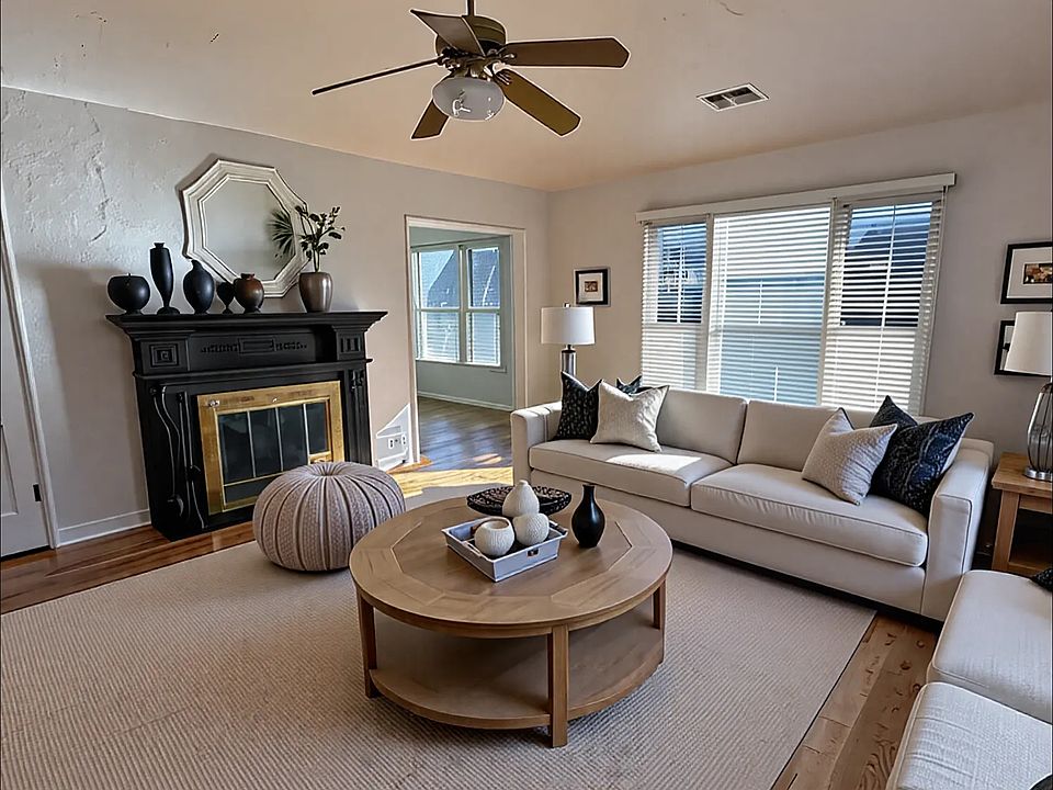 - Spacious living room with original hardwood floors, decorative wood-burning fireplace, high ceilings with recessed lighting, ceiling fan, and ample windows.
