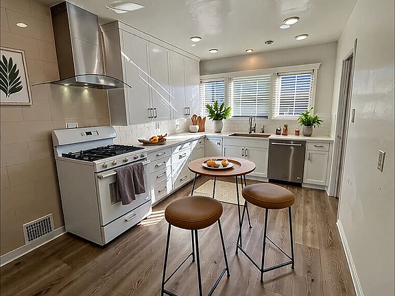 - Updated kitchen featuring tile countertops, modern cabinetry, and new stove and dishwasher.