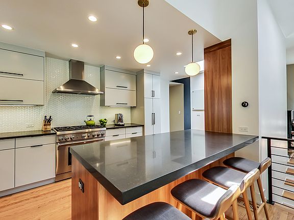 Impeccably and thoughtfully redesigned mid-century 3 bedroom plus office + 3 bathroom SFH in coveted East Winnetka location. High ceilings, modern finishes, and sky lights provide open, airy and naturally bright space. All new open concept chef's kitchen with breakfast bar features tastefully selected cabinets, backsplash, countertops, and open shelving that bring this home into the 21st century. High-end appliances include Thermador range & dishwasher, Best range hood, and Bosch refrigerator & speed oven. All three bathrooms are brand new: custom tile throughout, Hansgrohe fixtures in master, and glass doors all hand-picked with an eye for design. Fantastic floor plan with 2867 total square feet lives very spaciously! Secluded rear patio & grassy area plus large side yard provide ample outdoor living space. New copper plumbing, new full drain tile and sump system. Restored front steps, new garage door, new laundry, and new exterior lighting round out this updated and modernized home. Wonderfully located - steps to Green Bay walking/biking Trail, 5 min walk to Metra stop, steps to Village Green Park, Downtown Winnetka, and the lakefront.