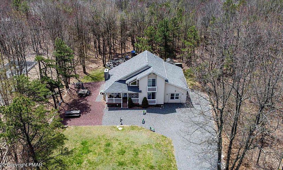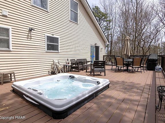 4bed 2bath pristine Emerald Lakes home, with access to the nearest lake and beach within walking distance, is just the house for you! The entrance invites you in with cathedral ceilings and spacious living area, as well as a comfy dining area and a kitchen equipped with new quartz countertops (with an extended peninsula). Sliding door from the dining area to a 570sqft deck, where you can relax in a newly installed hot tub. Other recent renovations include new flooring, new sinks and faucets, new bathrooms, and a playroom with installed decorative fireplace/heater. EVERYTHING was bought NEW for the house, which has Airbnb Super Host rental history! Enveloped in over half an acre of luscious forest that offers privacy, this gorgeous property greets you with an extended driveway and pleasant landscaping. The backyard offers a neatly paved terrace leading to an outdoor eating area, playground with rubber tiles and a practical storage shed. All the furniture indoor and outdoor is included. Practical concrete surrounds the house to protect the crawlspace and a newly installed roof tops the outdoor renovations! New HVAC ( 2023) Septic pumped and inspected (2023) The property is equipped with Arlo outdoor surveillance cameras. Close to most attractions like Kalahari, Camelback, Crossing Outlet Mall, and Mount Airy Casino! A great gem in the hearts of Pocono! AirBNB Friendly!!!