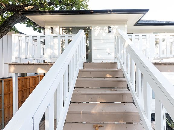 Upstairs Unit in Modern Craftsman Duplex in the Heart of Oak Cliff: Enjoy views from your large elevated porch in this beautifully and completely rebuilt two-story duplex perched on an elevated lot surrounded by mature trees, superbly located close to Bishop Arts. Every detail of this Oak Cliff Duplex has been renovated throughout and blends modern design with classic character from the inviting front porch and balcony to the terraced landscaping with accent lighting.