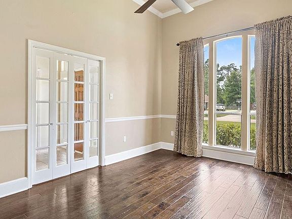 GREAT LOCATION! This 4 bedroom 2 1/2 bath home sits on an oversized lot in the highly desirable subdivison, The Woodlands. A gated community with a subdivision pool. Kitchen has lots of cabinets, under cabinet lighting and 2 walk in pantries. Hardwood floors in the living, dining area. Crown molding in living areas and primary bedroom. Very spacious floorplan. Rear yard access for storing boat or trailer and is beautifully landscaped including beautiful Satsuma tree. 2 car attached garage and additional 10 x 10 storage in yard on a slab with electricity. A/C is 18 mos old and hot water heater 2 1/2 years. Wired for surround sound. Preferred flood zone, Mandeville schools and close to the Causeway.