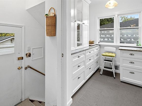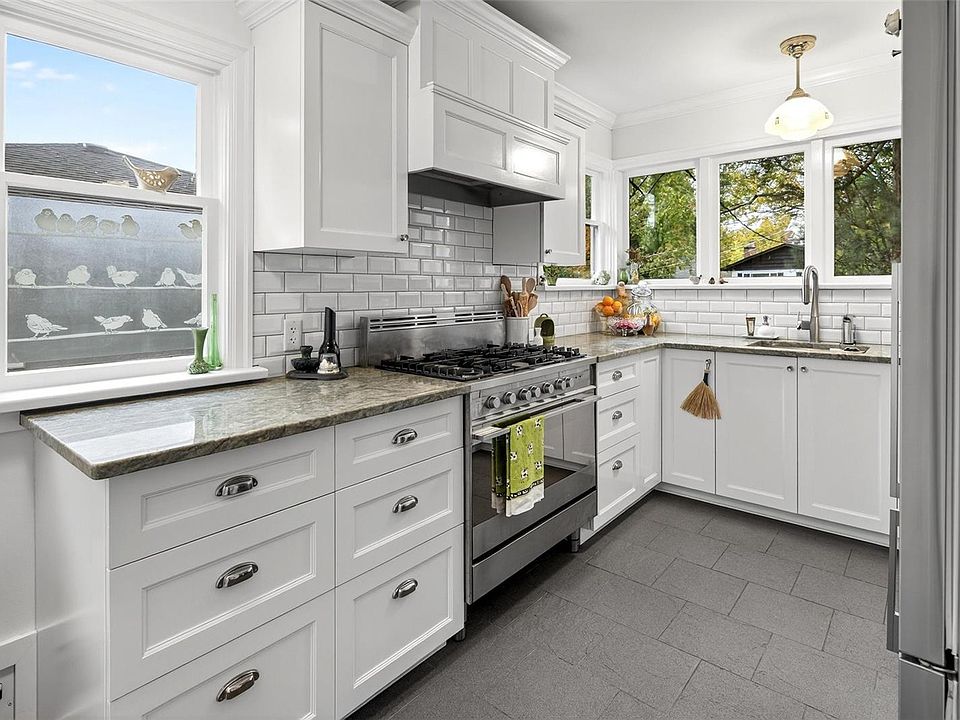 NEW LISTING! Updated Charm in one of Victoria's fav areas! Boasting a large, yet cosy living & dining area w large picture windows, arched doors, coved ceilings, wood mantel & built-ins. Updates: Kitchen 2011, Perimeter Drains 2011, Roof 2016, Hot water tank 2024, Gas to house, New paint in bath, New back deck & stairs, refinished Oak flrs. Chef kitchen w soft green marbled stone counter, light slate flr, wrap-around windows, pendant lights, custom wd cabinets w pantry & inserts. Lux Fisher Paykel appls: 5-burner built-in gas cooktop & oven, FP fridge & 2-drawer DW. Primary bed w walk-in closet, new painted bath. Lower: family rm w walk-out, bed w fir flrs, tile in family & laundry, storage, partial kitchen w freezer, sink, counter, cabinets. Nanny potential. Plumbing in place for full bath—sink & toilet installed, space ready shower, cold-storage. Private front yard, mature trees, long driveway; west-face yard w fruit trees, large det Garage! Walk to villages, parks, school & transit.